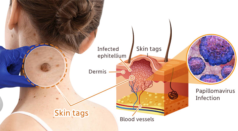 Skin tags, also known as acrochordons, are small, soft, benign growths that protrude from the skin. They typically appear as tiny, flesh-colored or slightly darker skin flaps, often attached to the skin by a thin stalk or peduncle. Skin tags are common, factors such as friction, hormonal changes, genetics, obesity, and insulin resistance may contribute to their formation.