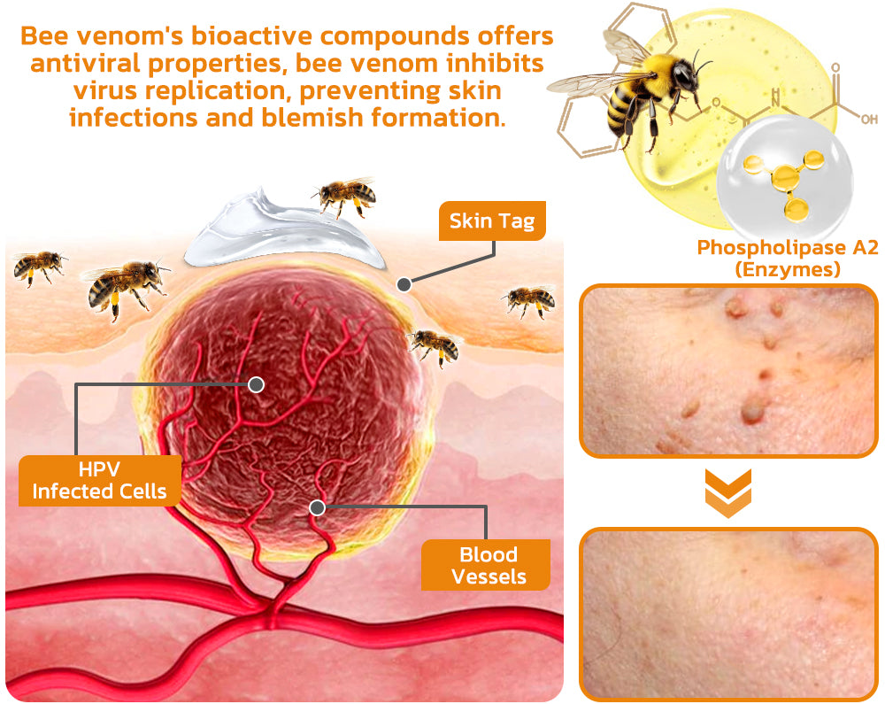 Bee Poison comprises multiple bioactive elements like melittin, apamin, and adolapin, which have been scientifically demonstrated to effectively combat skin tags or warts. Notably, among its enzymatic components, phospholipase A2 shines for its capacity to degrade abnormal tissue, streamlining the process of removing skin tags or warts.